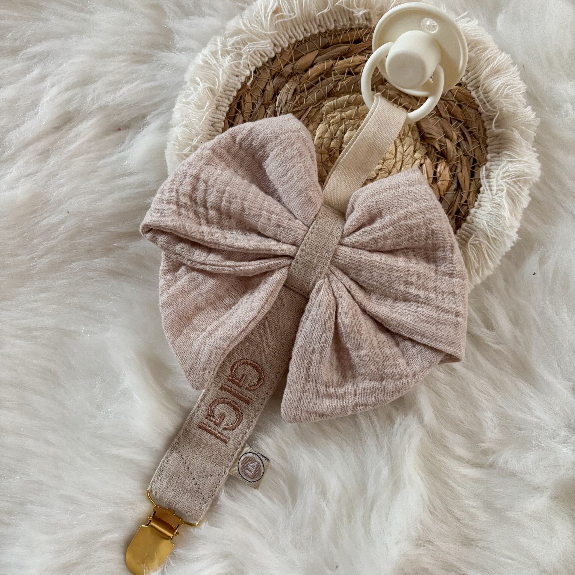 Speenkoord met handgemaakte strik en naam!