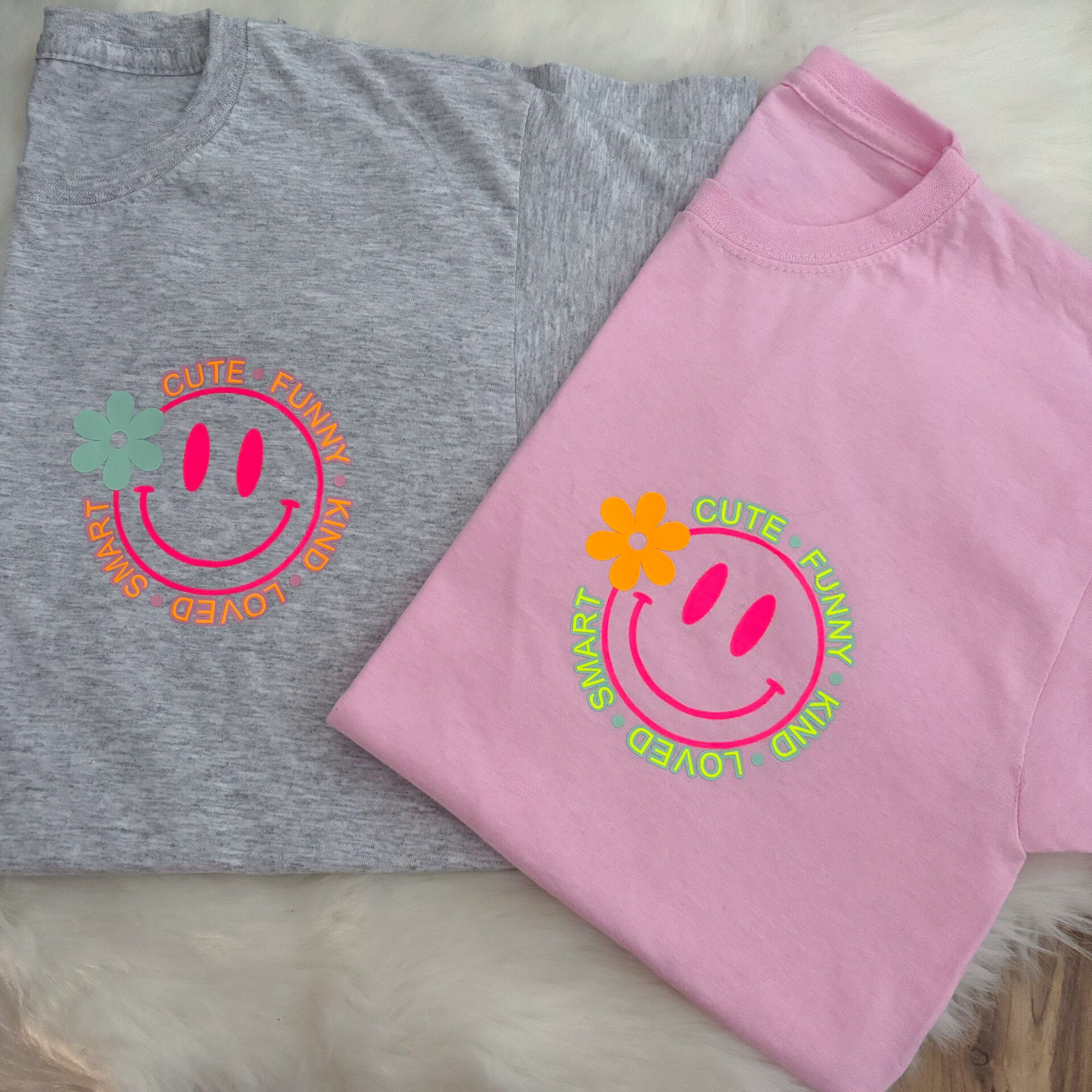 Oversized t-shirt met smiley en de tekst: Cool - Funny - Kind - Loved - Smart.