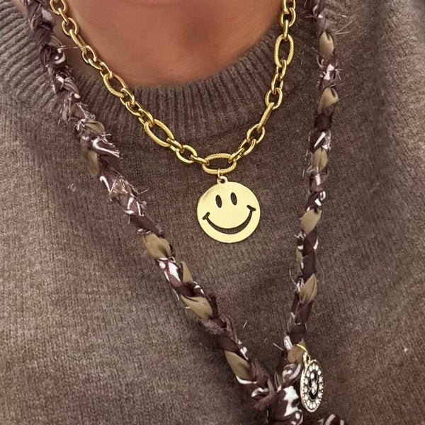 Grove schakelketting (2 soorten schakels) met smiley bedel.